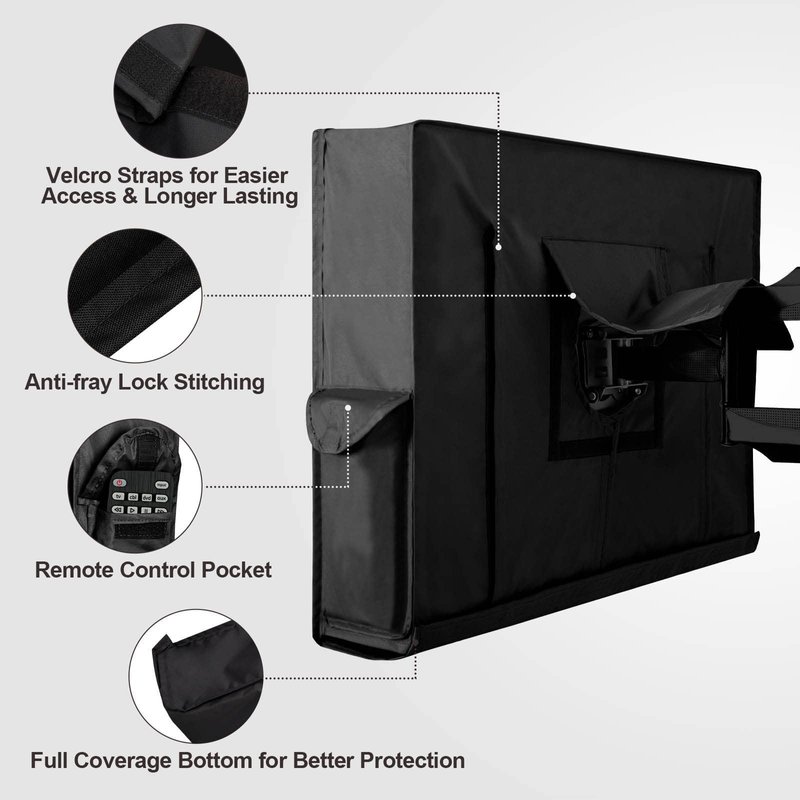 - INNOVATIVE DESIGN: Our outside TV covers are designed with heavy-duty velcro straps with fabric overlap to ensure more comprehensive protection, ease of use, and a more secure fit than zippers. The sealed bottom provides 100% coverage and 360 degrees protection of the entire TV. Also, we have added remote control pocket on the side for easy access.