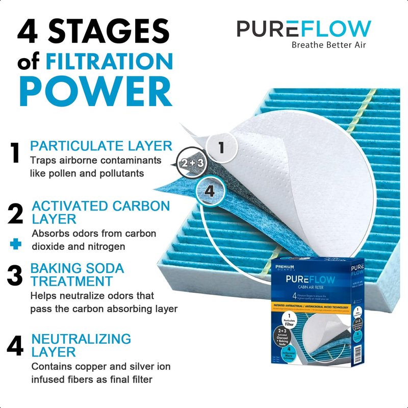 - NEUTRALIZING FINAL LAYER - The 4th Stage of PureFlow's advanced filtration technology includes copper and silver ions that neutralize fine contaminants help deliver the cleanest air to your vehicle's passengers.