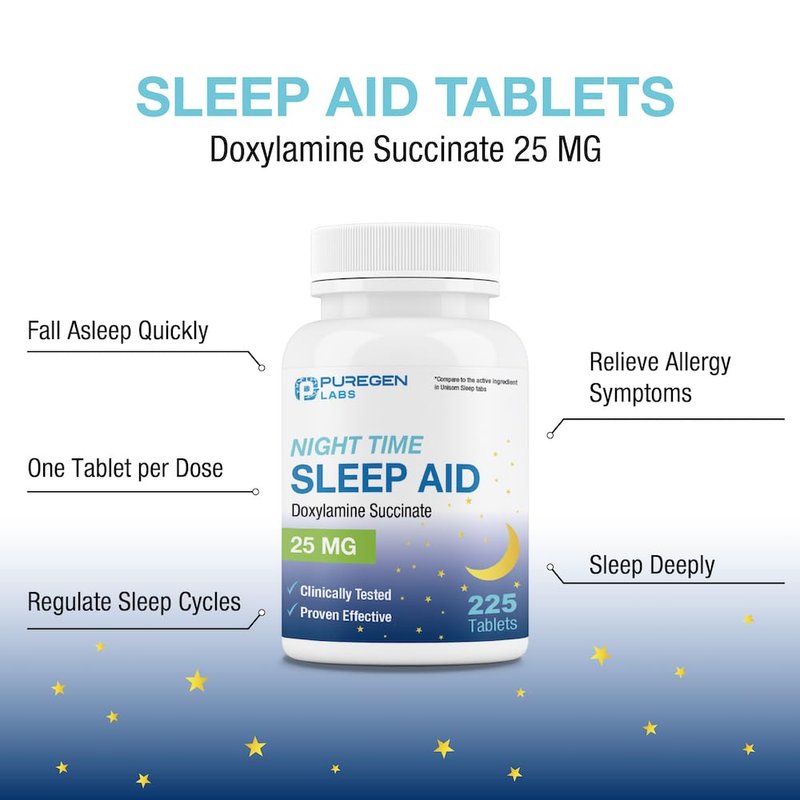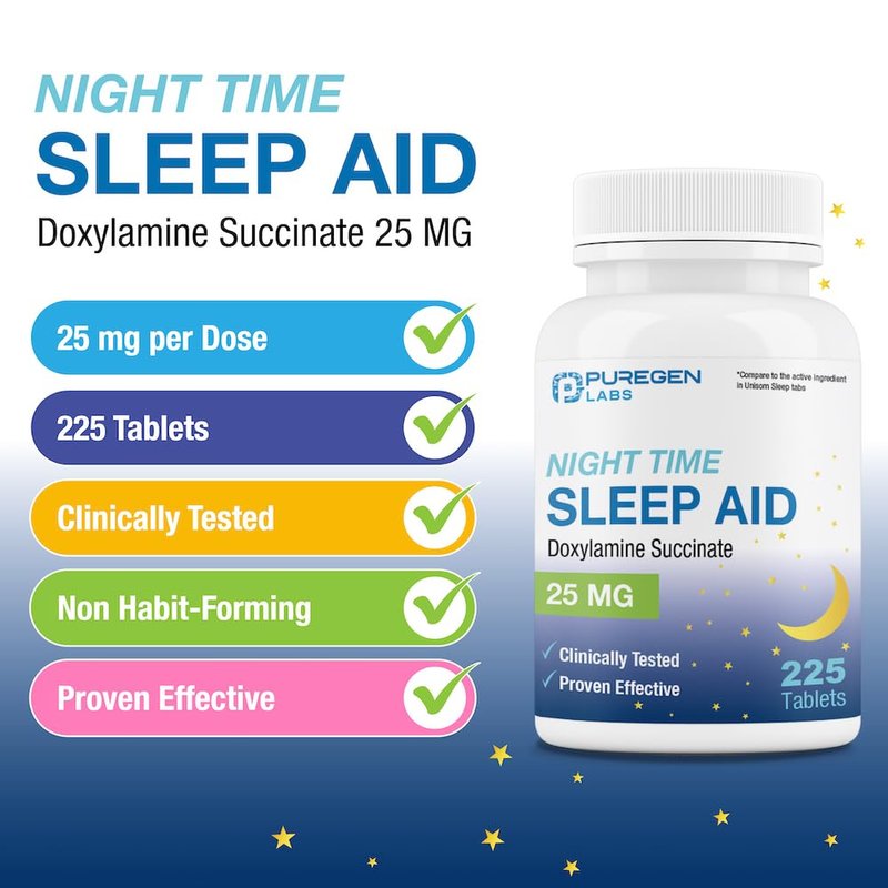 Puregen Labs Doxylamine Succinate 25mg | Nighttime Sleep Aid | Safe & Effective | Non-Habit Forming Sleep Aid | Made in USA | 225 Tablets