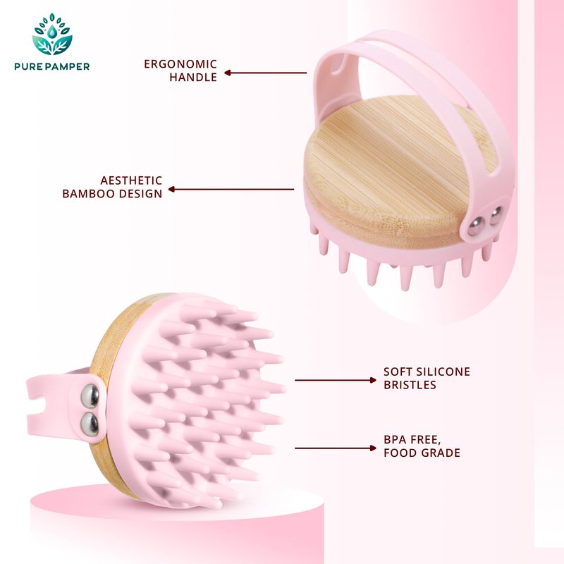 PurePamper BPA-Free Silicone Bamboo Hair Scalp Massager and Body Brush-Promote Relaxation-Increase Blood Circulation-Removing Dandruff (Pink)
