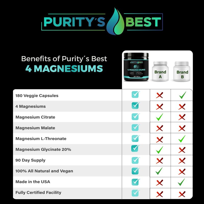 Purity's Best 4 MAGNESIUMS, Premium Magnesium Glycinate, Malate, L-Threonate, Citrate, 300mg, 180 Veggie Capsules, Third Party Tested, 3 Months’ Supply, Muscle Energy Nerve and Cognition Support