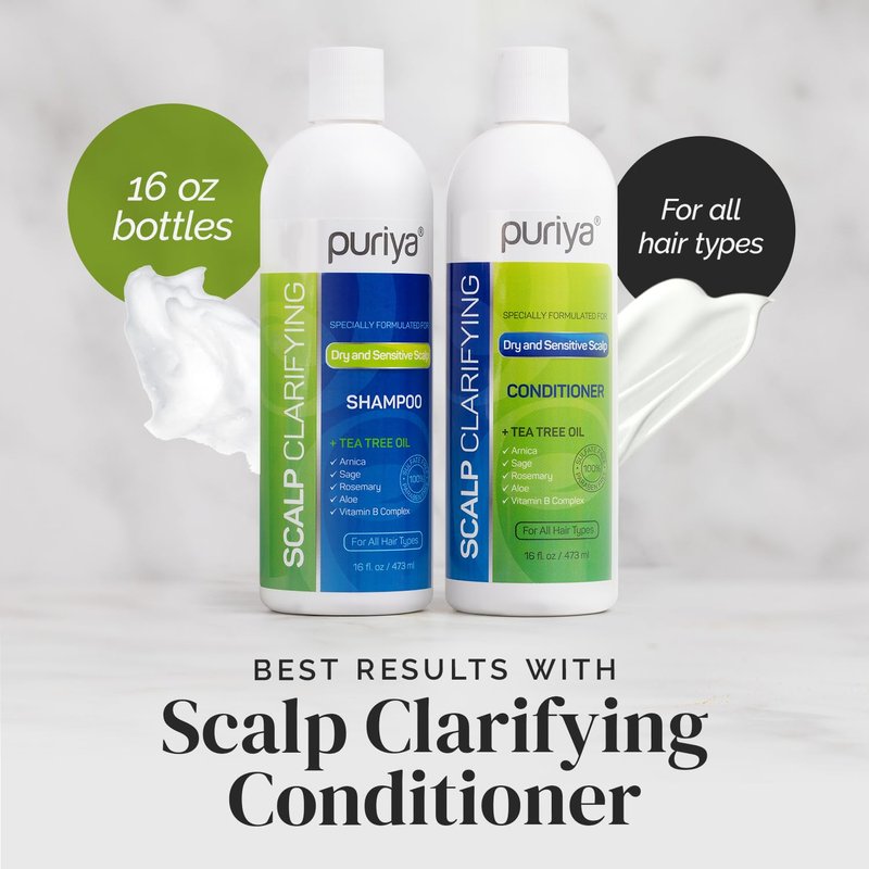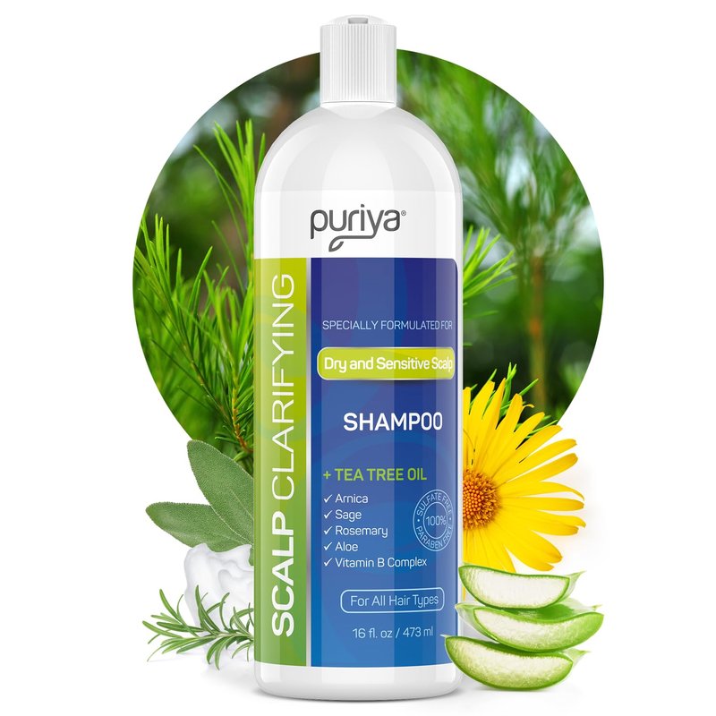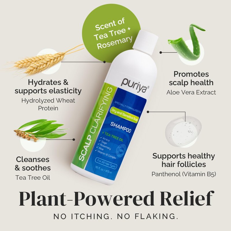 Puriya Tea Tree Clarifying Shampoo. Plant Rich Dry Itchy Scalp Relief, for Kids, Adults, Sulfate Free, No Harsh Chemicals Seen in Dandruff Treatment, Seborrheic Dermatitis, Psoriasis Shampoo, 16 oz