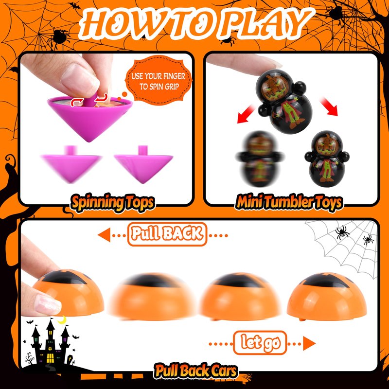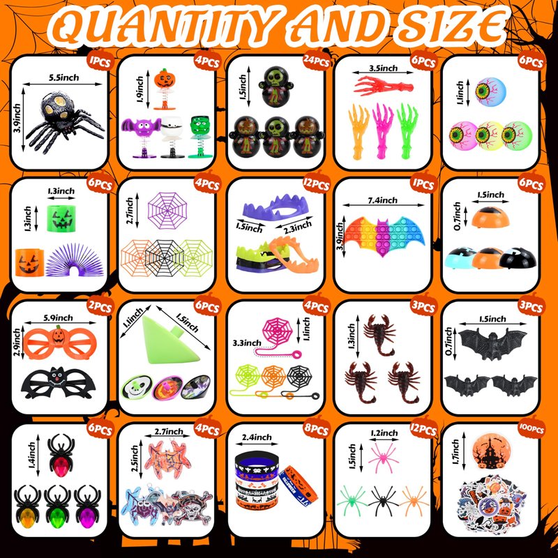 - 【Endless Fun for Kids】 Our Halloween toys set is designed with charming Halloween theme, with spining tops, spider rings, pumpkin glasses and more to ignite kids' creativity. Halloween goodie bag stuffers can fulfill a variety of children's needs