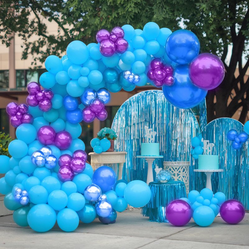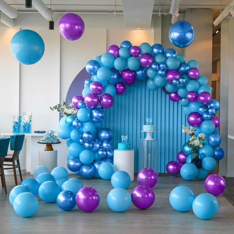 - 12-inch blue-purple balloons: Package includes 10 royal blue balloons, 8 metallic purple balloons, 7 metallic blue balloons, 10 turquoise balloons, 8 vintage purple balloons, 5 confetti blue-purple balloons, 2 balloon ribbons