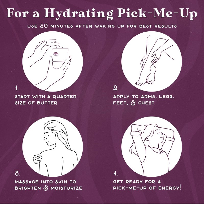 Our Sunrise Body Butter has the energizing properties of caffeine in a luxurious blend infused with caffeine powder. This 2-ounce jar is equivalent to a 1/2 cup of coffee- so your skin gets to enjoy an instant pick-me-up that lasts all day. It's also full of fatty acids and vitamins that will nourish and moisturize your skin. Start your day with a dose of caffeine and skin-softening ingredients. This body butter contains sunflower oil, jojoba oil, and aloe vera providing moisturizing benefits along with caffeine. It provides instant, dry skin relief and is perfect for anyone looking for natural solutions to common skin issues.