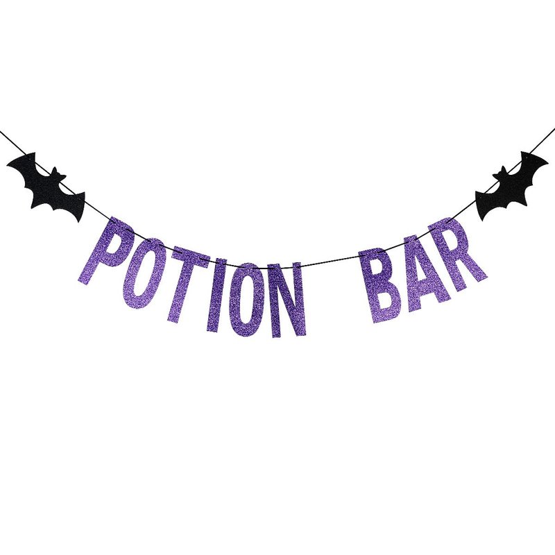 - What you will get: 1Pcs Purple Glittery Potion Bar Banner,Unique Bat Design,Perfect for Halloween Party Decorations,Worth buying it!!