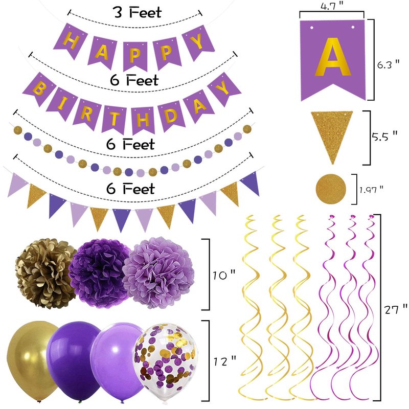 - Party Pack List Everything You Need - 1 pcs Happy Birthday Banner; 9 pcs tissue paper flowers: lavender/purple/gold; 5pcs confetti balloons 12''; 4pcs gold balloons 12''; 3pcs dark purple balloons 12''; 2pcs light purple balloons 12''; 6pcs hanging spirals; 1 string circle dots garland and 1 string triangle banner.