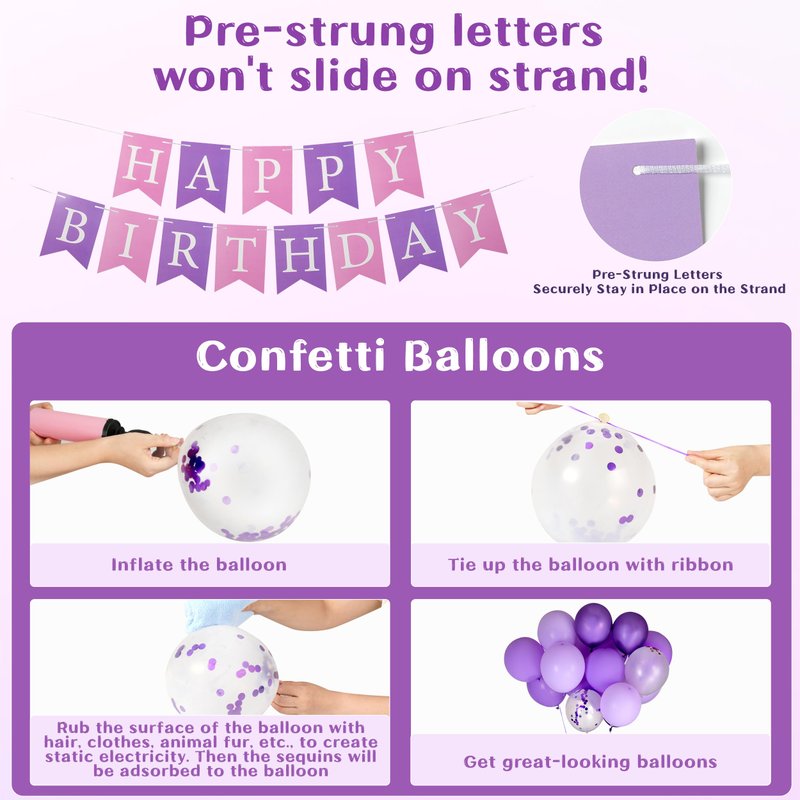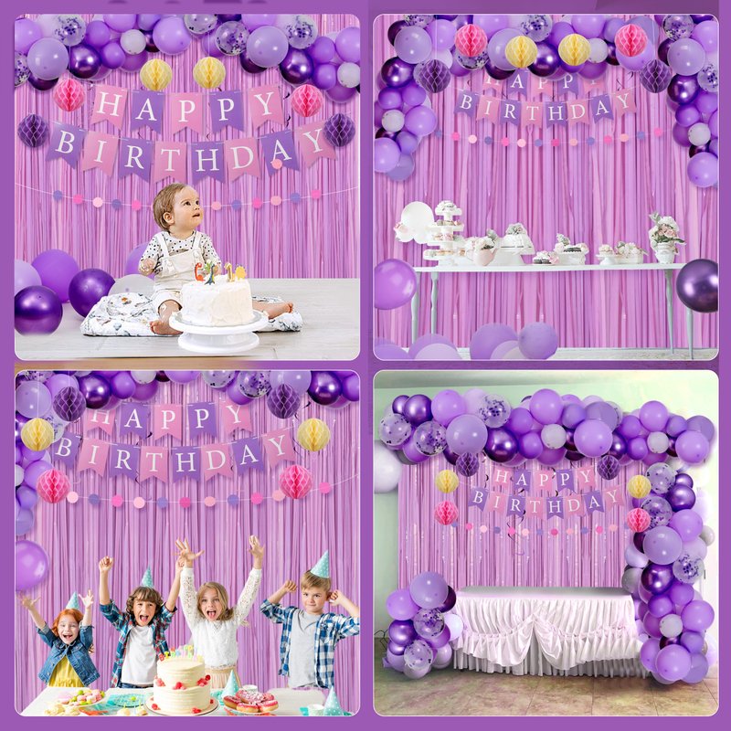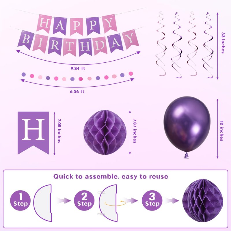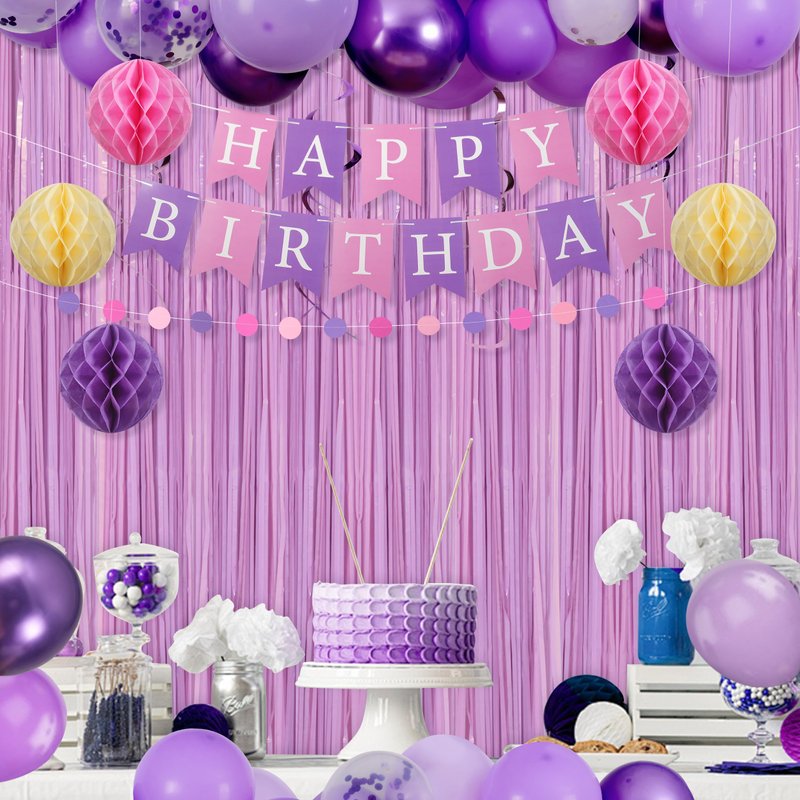 - The Purple Happy Birthday Banner Decorations Kit: The package includes 1 happy birthday banner, 2 fringe curtain backdrop, 1 circle dot garland, 10 deep purple balloons, 10 purple balloons, 5 purple confetti balloons, 5 metallic purple balloons, 8 hanging ceiling decorations, 6 tissue paper pom poms, 100 double-sided glue dots, and 2 balloon ribbons. Our party decoration package can add a gorgeous atmosphere and create the perfect party ambiance, making it ideal for girls' birthday celebrations!
