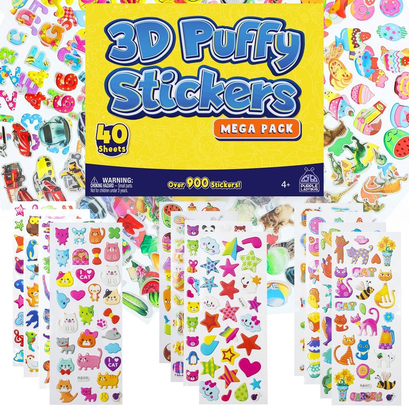 PURPLE LADYBUG 3D Puffy Stickers for Kids Activities - 40 Bulk Sticker Sheets with 950+ Cute Puffy Stickers for Toddlers 1-3 Girls & Boys - Sticker Pack Includes Fish, Animals, Alphabet, Cars, & More