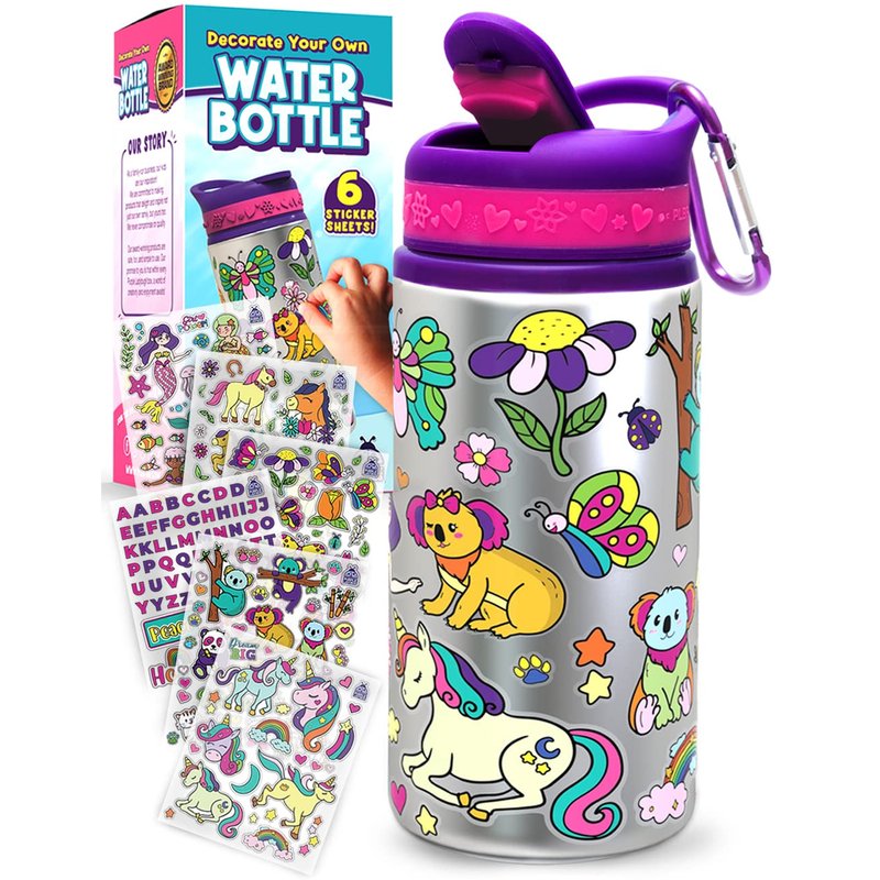 - Everything you need included to create a DIY personalized water bottle! This set comes with 6 sheets of trendy vinly stickers including letters, mermaid, unicorn, panda, horse, flowers, koala, cats, and many more! Gives your little or tween girl lots of options to bling out their bottle! Plus we included a carabiner to hang the bottle!