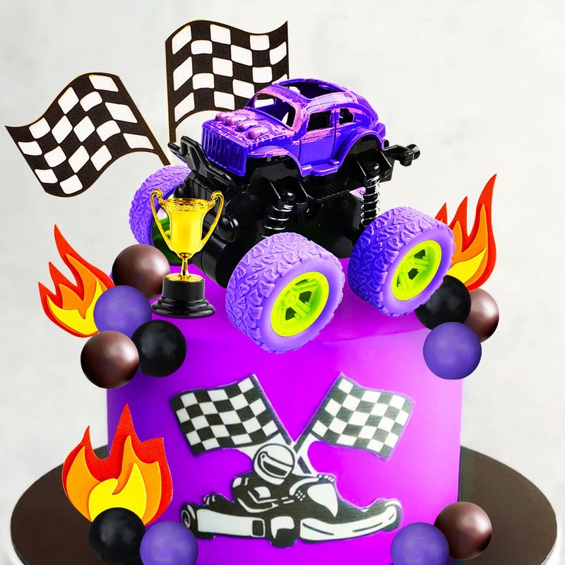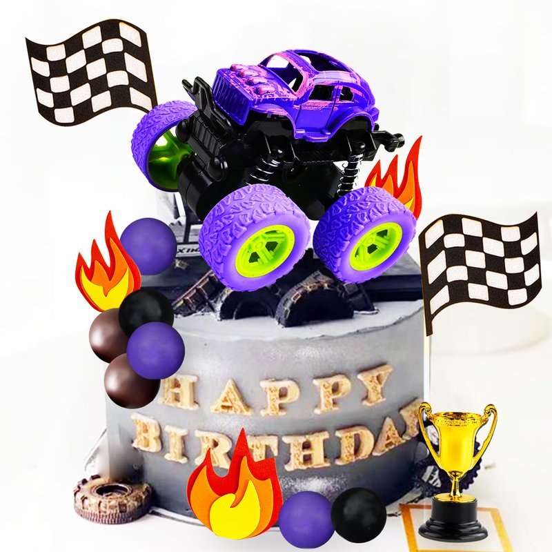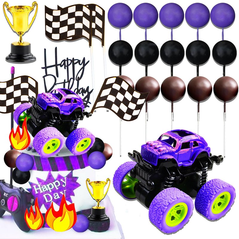 - Monster Truck Cake Decorations:This set includes 1 Xpurple monster truck toy car, 1 Xtrophy, 1X pack of flame decorations, 2 X plastic stick chevron flags, 15X foam balls (5X purple, 5 Xblack, 5Xdark brown) perfect for creating exciting cake or cupcake displays!