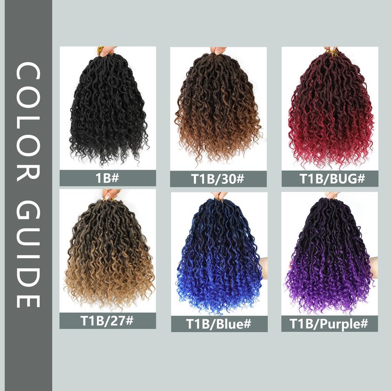 - 2. Curly Faux Locs Crochet Hair Colors & Weight: 8 Colors are Avaliable-1B#,T27#,T30#,TBUG#,T1B/blue#,T1B/purple#,T1B/350,27/613#;New Goddess Boho Hippie Locs Wavy Crochet Hair 12 inch,45g/Pack,16 Roots/Pack,8 Packs/Set,Usually to Most Lady, 6 Packs Can Full a Head, It Depending on How Full You Want to Design.