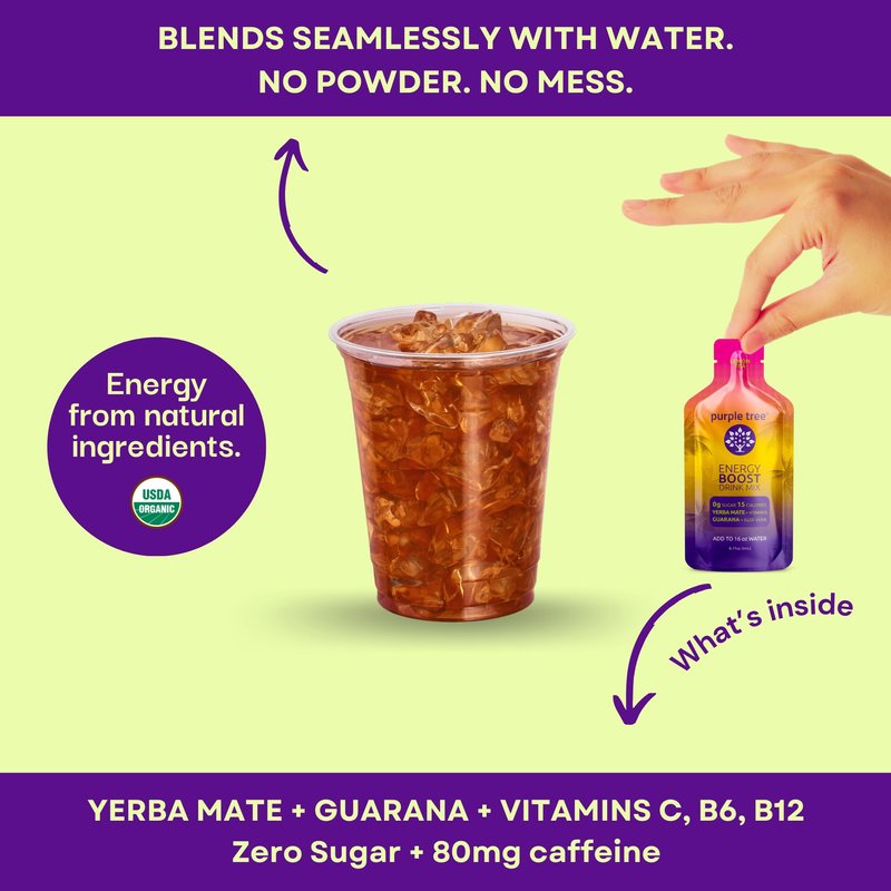 Purple Tree is an organic energy boost drink mix made with refreshing flavors and zero sugars. Purple Tree is an ideal daily replenisher as it's made with plant-based nutrients, flavored with real ingredients, and formulated with essential vitamins for a revitalizing, delicious tasting charge of mental and physical energy. Add to ice water and enjoy! Your taste buds and body will thank you.