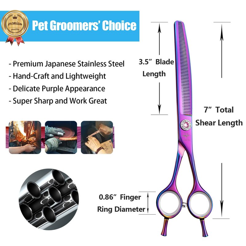 - MULTIFUNCTIONAL - 7 inches scissor with 3.5 inches cutting blades, the purple dog thinning shear is ideal for pet hospital, pet salon, and family to use on dogs, cats and so on. You can become a professional beautician at home do pet grooming, saving time and money. Add the dog grooming shear to your Amazon Cart and it will exceed your expectation to create pretty and sophisticated pet hair style. It is also definitely the perfect gift for relatives and friends, especially for dog or cat lovers.