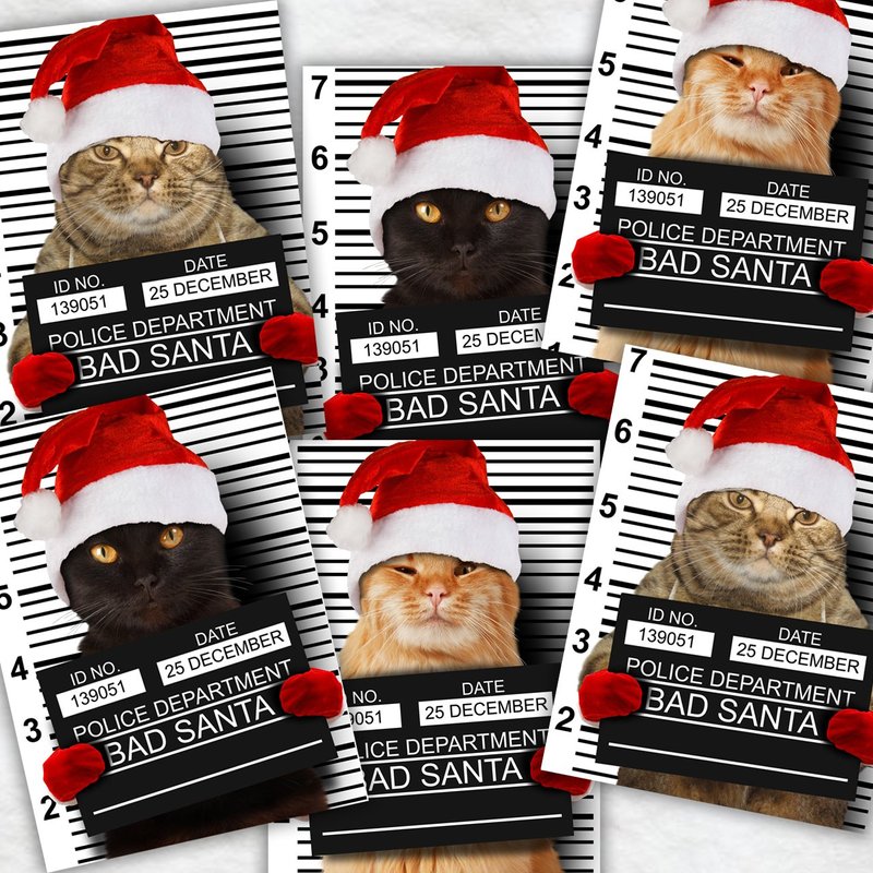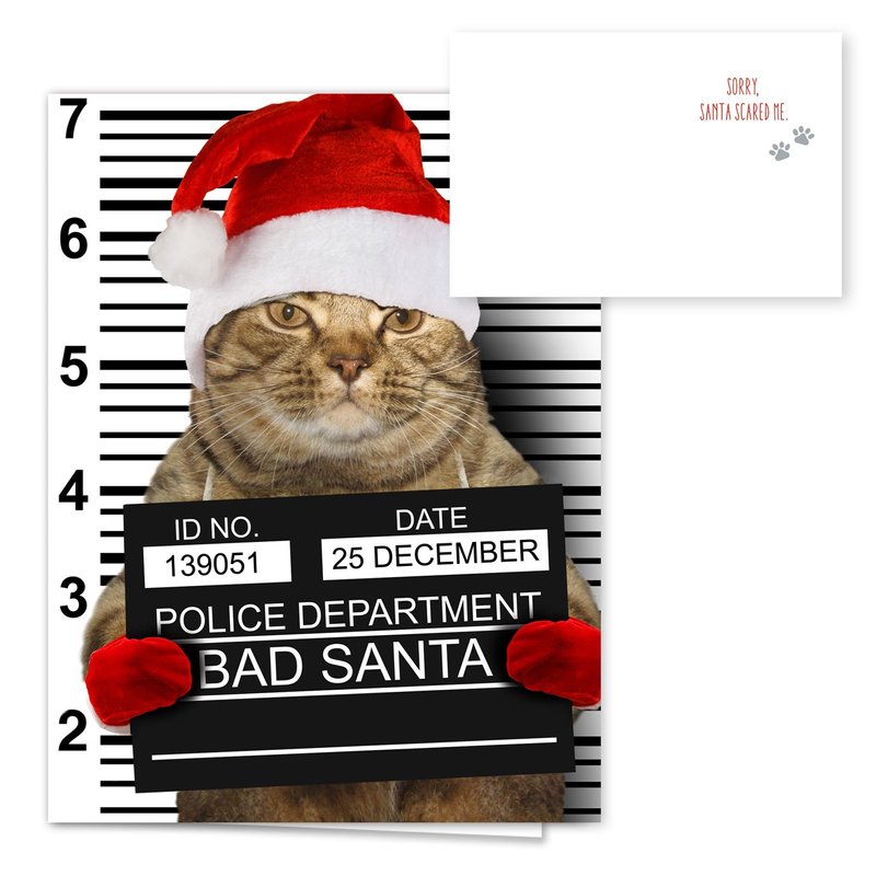 - Design: These funny cards feature "bad Santa" cats taking their mug shots. There are 3 designs and 8 cards of each design.