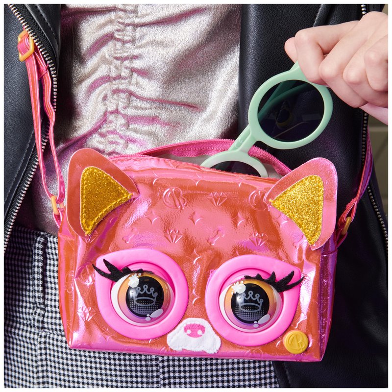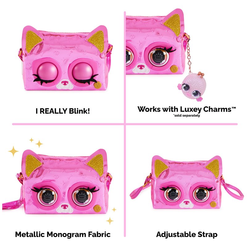 - BLINKS, RESPONDS TO TOUCH: This super shiny girls purse has expressive eyes that really blink! On-the-go, your Purse Pets blinks and interacts with you. Hold her head and she’ll blink rapidly and make camera noises!