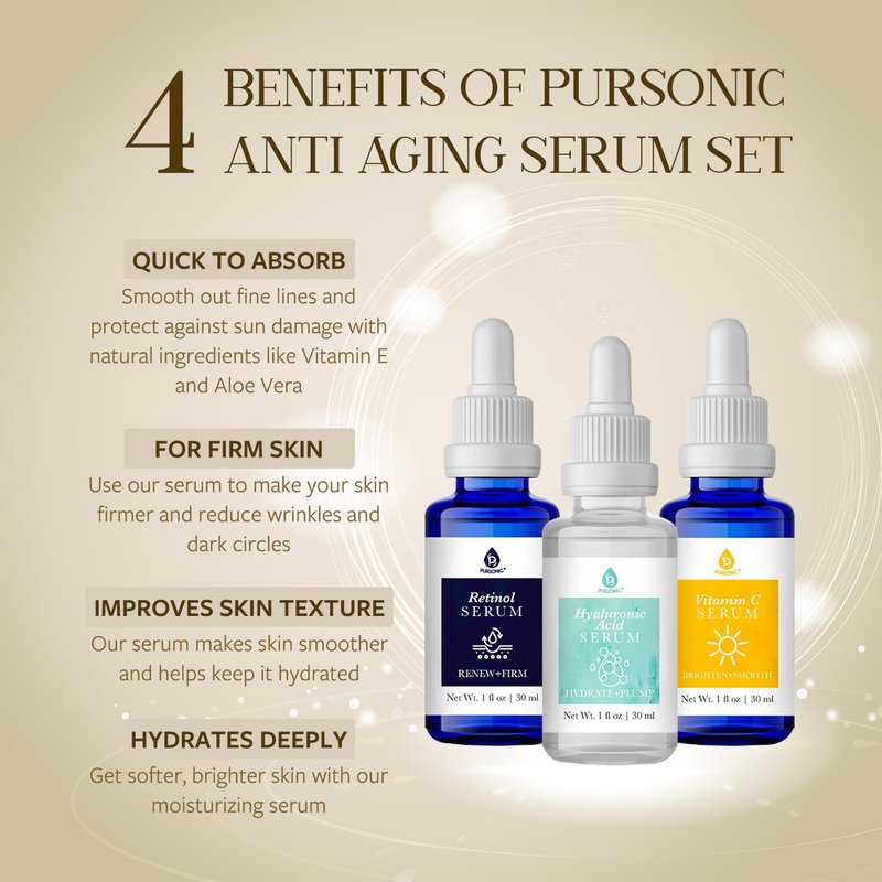 Pursonic Anti-Aging Face Serum Set 3 Pack (Hyaluronic Acid, Retinol Serum & Vitamin C Serum for Face): Revitalize your skin with the Pursonic Anti-Aging Serum Set for the Face, a dynamic trio featuring hyaluronic acid serum for face, retinol serum for face, and vitamin C face serum. Our nourishing formula deeply hydrates, moisturizes and plumps up dull skin for a more radiant and even-looking complexion. This power trio face serum stimulates collagen synthesis, reducing fine lines, wrinkles, and sunspots for a visibly smoother and more youthful complexion. Enriched with organic ingredients such as Vitamin E, gotu kola, jojoba oil, and aloe vera, these serums offer deep hydration and nourishment. Suitable for all skin types, our formula is gentle yet effective, working as a dark spot and acne remover. Cruelty-free, and free from harsh chemicals like parabens and silicones. Elevate your beauty routine with the Pursonic vitamin C retinol hyaluronic acid serum set, unveiling radiant, age-defying skin. Helps lighten the appearance of skin and soothe blemishes, increase moisture, and elasticity in skin. — About Us: Pursonic is a family-owned business with roots in manufacturing since 1971. Based in NYC, the PURSONIC brand was launched in 2012, and it was geared to offering premium products at a value price. Our commitment is to introduce new, innovative, and exciting products that all can afford.