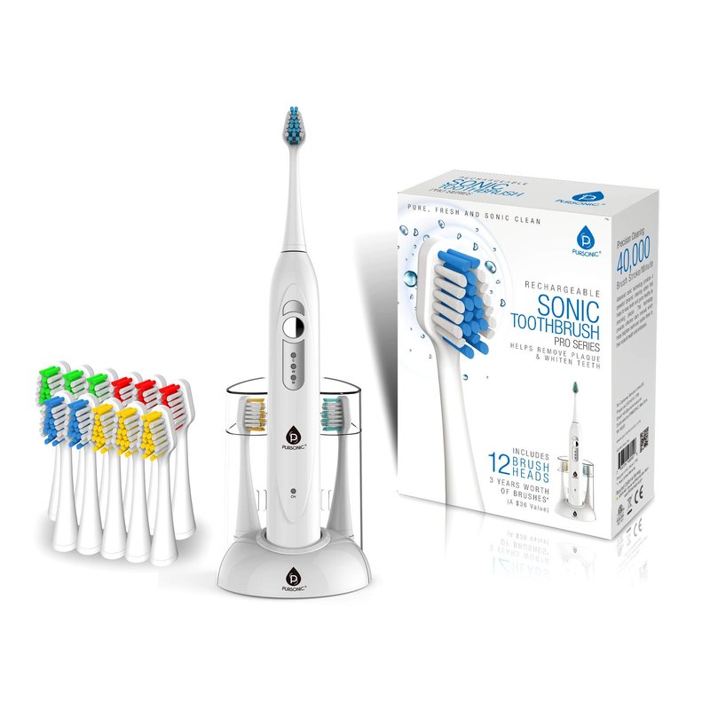 Pursonic S430 SmartSeries Electronic Power Rechargeable Sonic Toothbrush with 40,000 Strokes Per Minute, 12 Brush Heads Included (White)