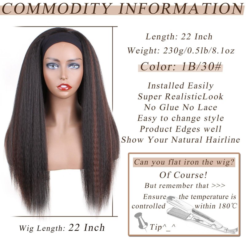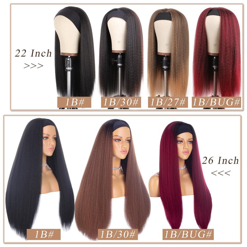 PWEOUKE 22 Inch Glueless Kinky Yaki Straight Headband Wigs Long Hair Wig High Temperature Heat Resistant Synthetic Head Wrap Wigs for Black Women, 1B30 Mix Brown