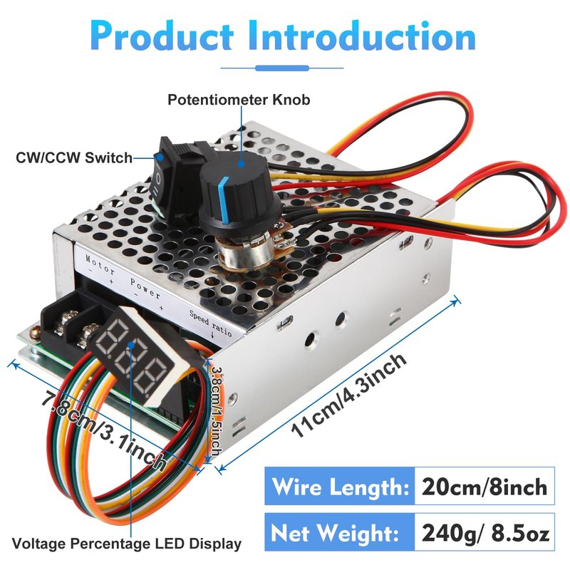 - ♕【Easy to Operate】The stepless motor controller has a simple potentiometer knob adjusts the motor speed from 0% ~ 100% smoothly. And LED display screen shows the motor speed from 0% to 100% of the rated speed. The input voltage of PWM motor speed controller should be equal to the rated voltage of the motor within 10V-55V,or it will be burnt.
