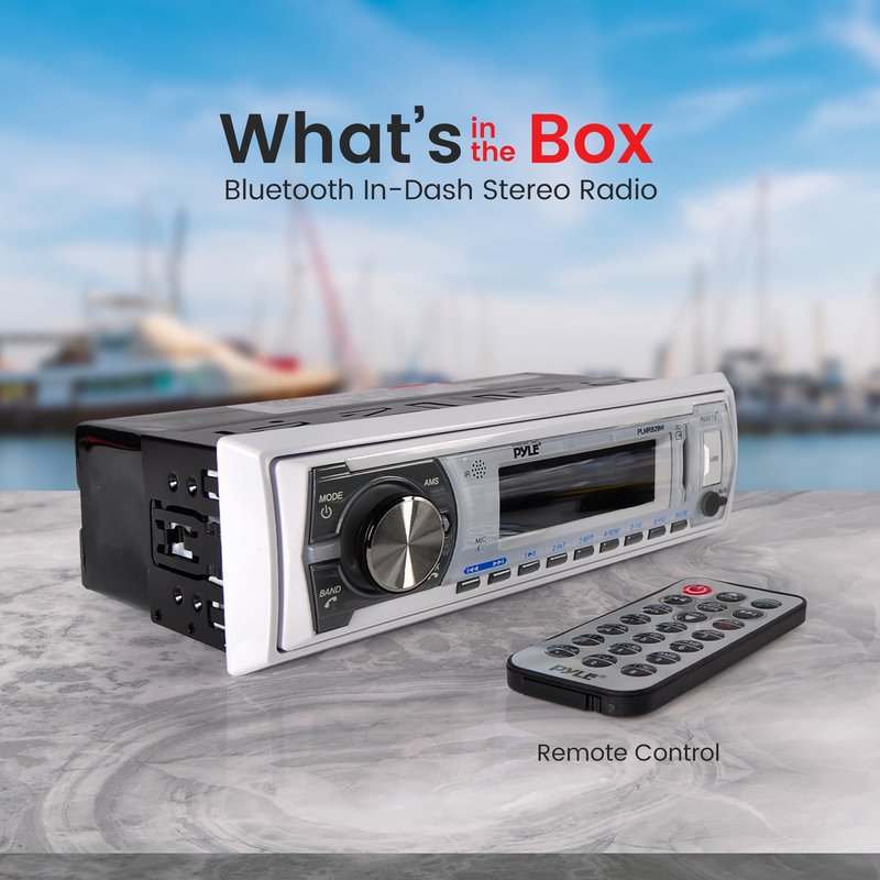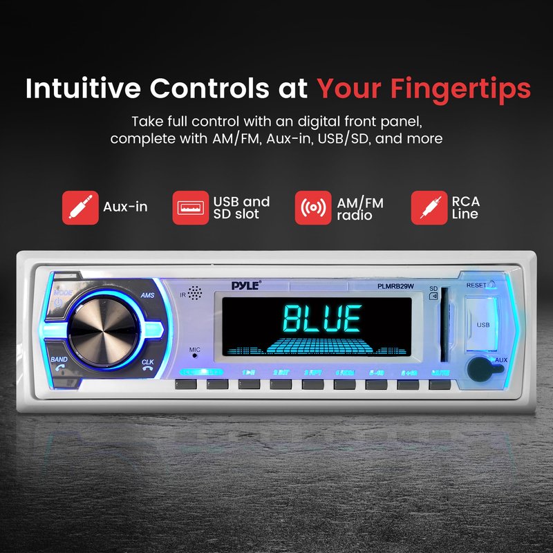 Pyle Marine Bluetooth Stereo Radio - 12v Single DIN Style Boat In dash Radio Receiver System with Built-in Mic, Digital LCD, RCA, MP3, USB, SD, AM FM Radio - Remote Control - PLMRB29W (White)