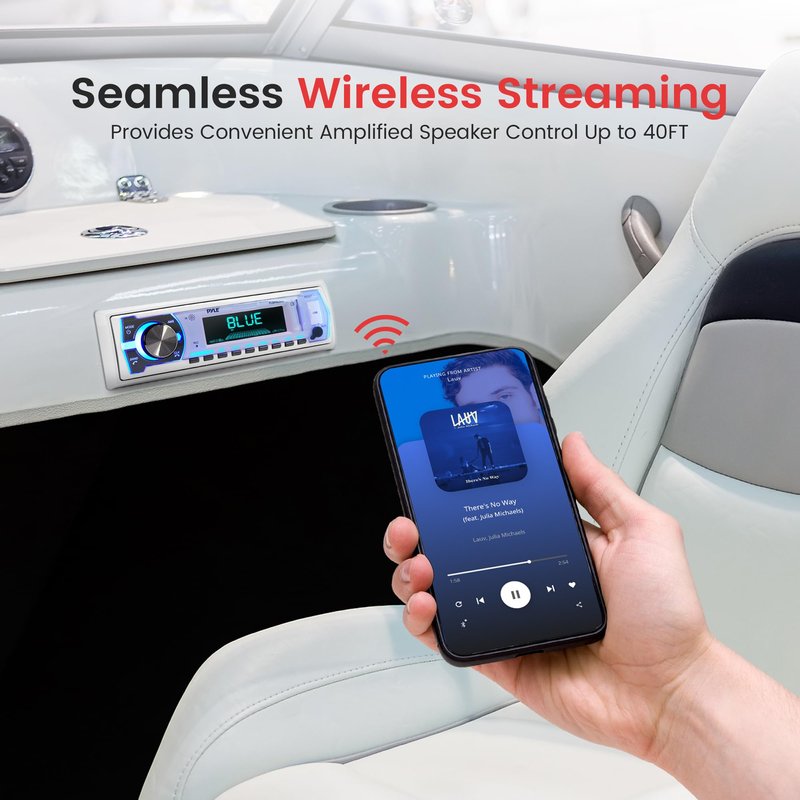 - 300 WATT POWER: Let the music flow while you stay afloat with this 12v marine radio receiver by Pyle. It features 300 Watt (75W x 4) peak power output and EQ configuration so you can control the bass, treble, balance, fader for a high quality sound
