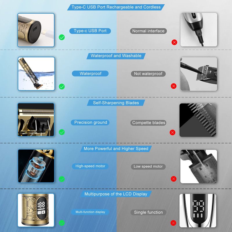 The cordless hair clipers for men professional LCD screen displays the power level to avoid the embarrassment of sudden power failure. Designed with Lcd battery power display ,Upgrade Powder Metallurgy Blade, Metal texture carving hair clippers, the overall pattern makes you feel more artistic. pynogeez lcd hair clippers professional hair trimer has 12 months warranty.