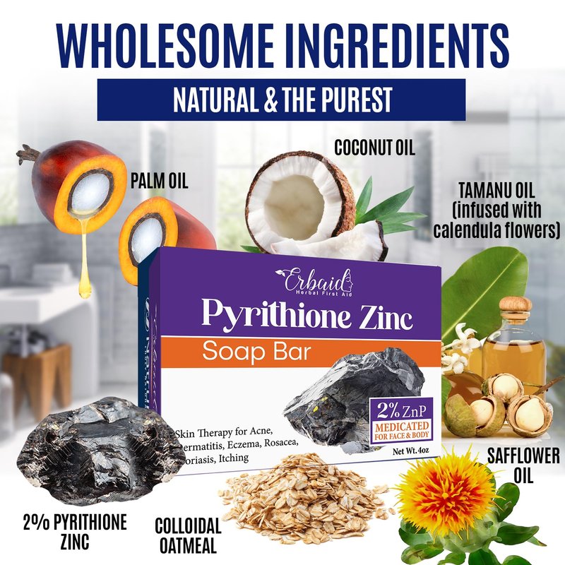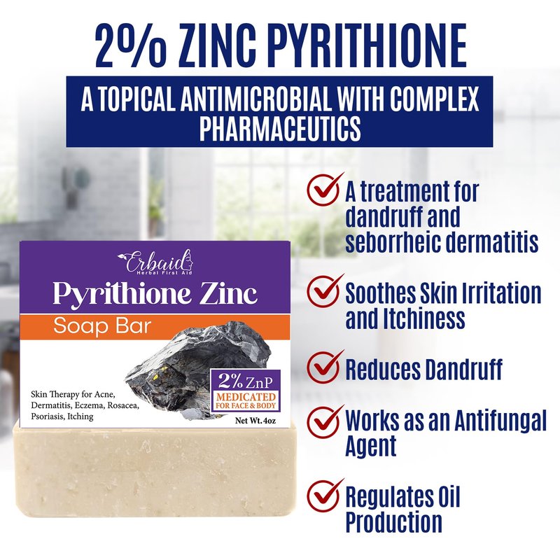 - 2% PYRITHIONE ZINC BAR SKIN SOAP: Found to possess healing and defense properties, zinc pyrithione is a synthesized high quality grade ingredient proven to repair skin with its cleansing and soothing qualities.