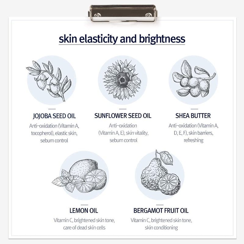 - SKIN ELASTICITY AND ALLEVIATED: Strong antioxidant ingredients such as Jojoba seed oil, Sunflower seed oil, Shea butter, Lemon oil and Bergamot fruit oil, having plenty vitamins and minerals, improve skin elasticity and brightness. Various herb oil, Rosemary leaf, Lavender oil and Geranium oil, transforming irritated skin into alleviated and healthy skin.