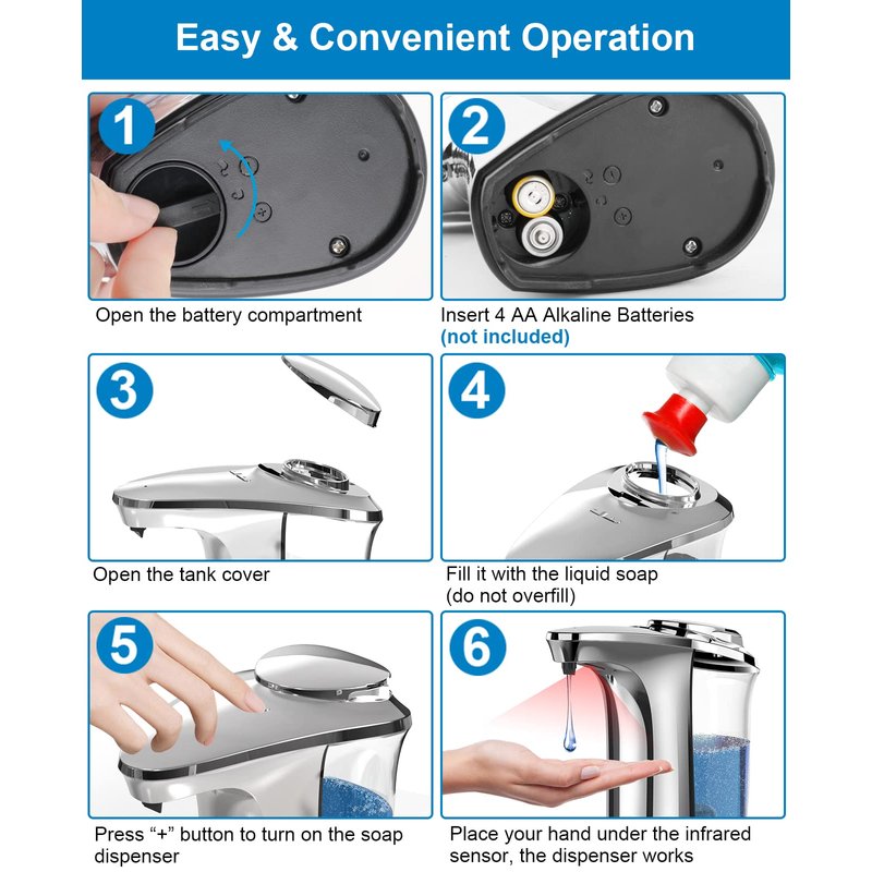 - [Wide Compatibility Soap Dispenser] This touchless soap dispenser operates on 4 AA Alkaline batteries (not included), which can be used in any occasion without limits on the power outlet. Suitable for multiple occasions, such as home, hotel, school, office, and other places. We will provide 2-year quality assurance and lifetime professional service, please reach out to us if any help is in need.