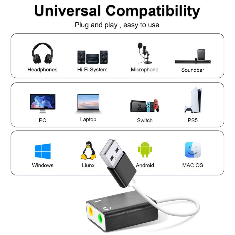 - WIDE COMPATIBILITY: The USB A to 3.5mm jack audio adapter is compatible with Windows 10/11, Linux, PS5, PS4, PCs, laptops, speakers, external TRS microphones, headphones and more. But please note that it only supports devices that can recognize USB audio driver properly, not TV or car.