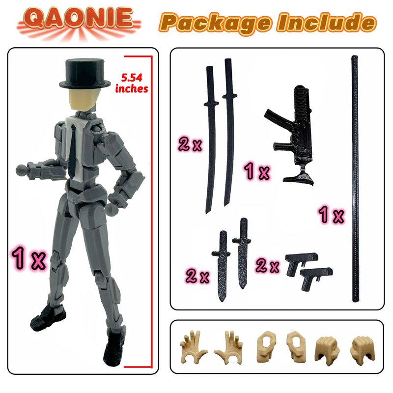 Each figure is equipped with multiple movable joints, allowing for flexible bending and swinging. This high level of mobility enables the creation of various postures and actions, making it extremely helpful for drawing, painting, and character photography. It serves as an excellent tool to practice sketching. 3D printing production: All dolls are produced using 3D printers and manually assembled with PETG environmental plastic materials. Please note that there may be some minor flaws in the models; perfectionists should take caution! (Figure height is approximately 5.54 inches) Accessories: The doll comes with a stand, six interchangeable hands, many sword stick gun, and armor (please note that accessory colors are all black). Creativity and imagination: Adjust the doll's posture according to your own imagination and creativity to create unique stories and adventures. Versatile applications:You can use them on car dashboards, desks, backpacks, and more, all of which are excellent decorations that allow you to play with toys when you are anxious. its will relieve your high tension and prevent mental exhaustion.