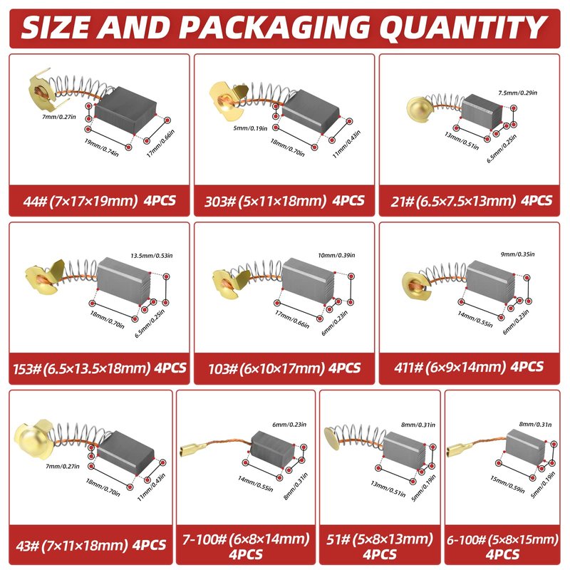 QCDENG 40PCS Electric Motor Carbon Brushes Replacement Repair Tool Set,10 Different Sizes Graphite Carbon Brush for Motor