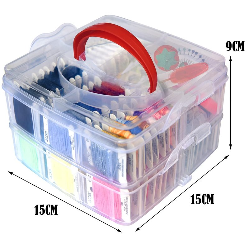 - Cross stitch projects can be easily started with the embroidery kit tool: 1 pcc pin cushion, 2 gold metal sewing needles, 2 plastic threaders, 1 scissors. 1 x colorful seam ripper, 1 piece of tape (60 inches), button set, 1 clear 2-layer finishing bag storage