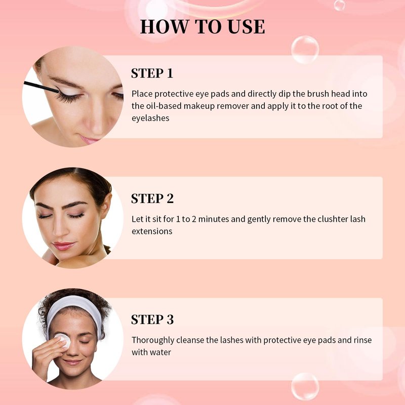 - 【Steps】1. Apply lash remover to the root of the tufted lashes where there is glue and wait 35 seconds for the lash glue to dissolve. 2: Brush lashes with false lash remover several times from top to bottom until the clusters come off. 3: Remove the eyelash clusters or cosmetic residue with a cotton pad and rinse your eyes until there is no residue.
