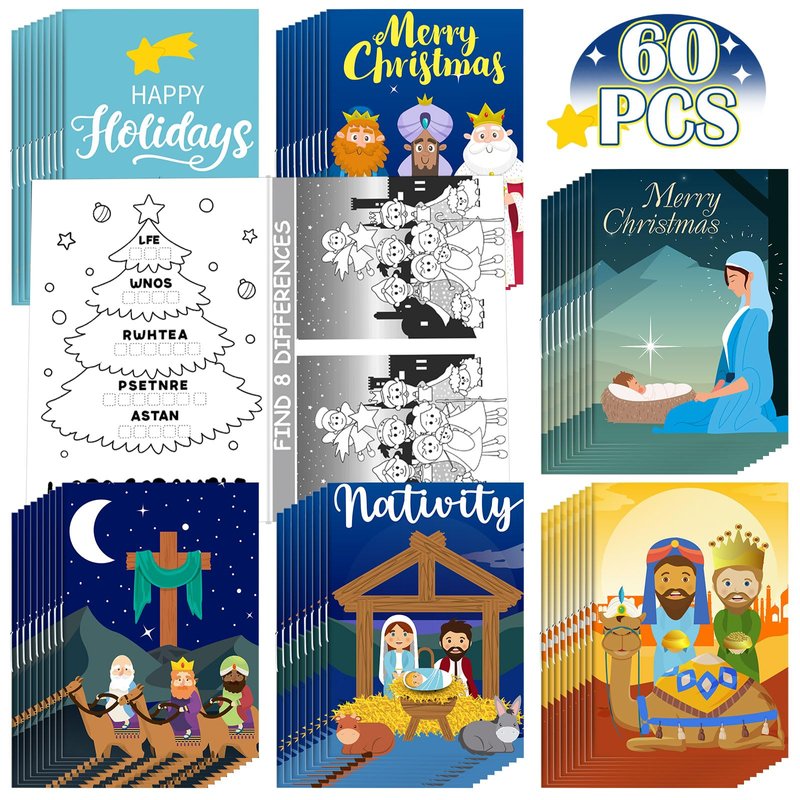 - Christmas Activity Book Bulk: there are 60 pieces of Christmas nativity activity books for kids in the package, comes in 6 styles, 10 pieces for each style, which are sufficient for you to distribute to your kids or little guests at the Christmas party