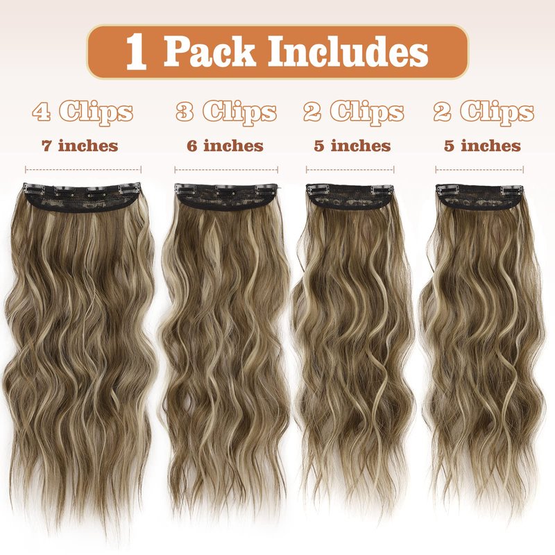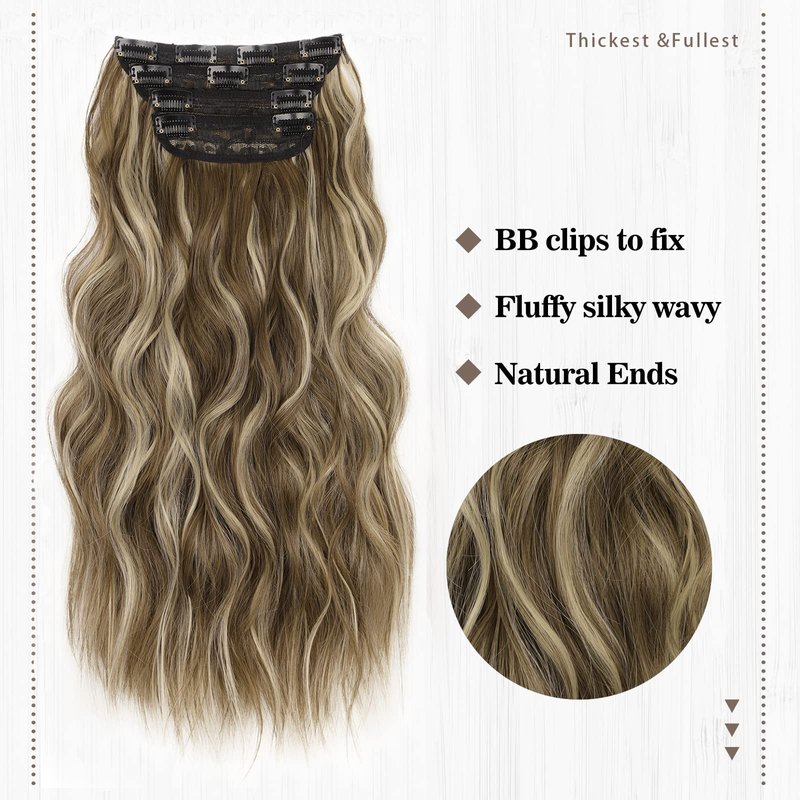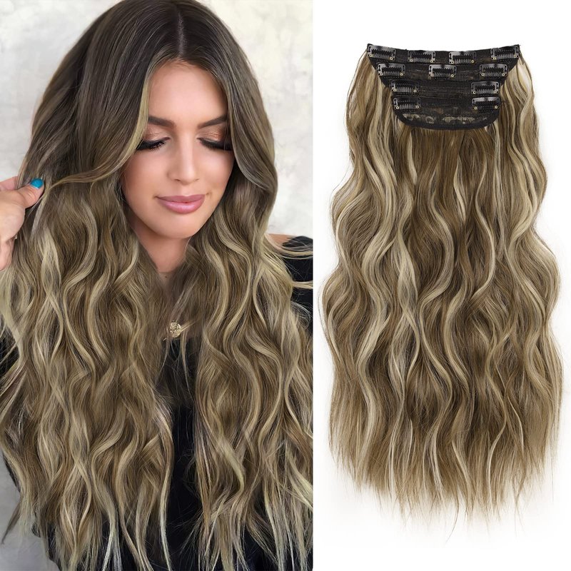 QGZ Clip in Long Wavy Hair Extensions Synthetic 4 PCS Thick Hairpieces for Women 20 Inch Long Fiber Hair Extension for Daily Party Use (Medium Brown Highlighted Blonde)