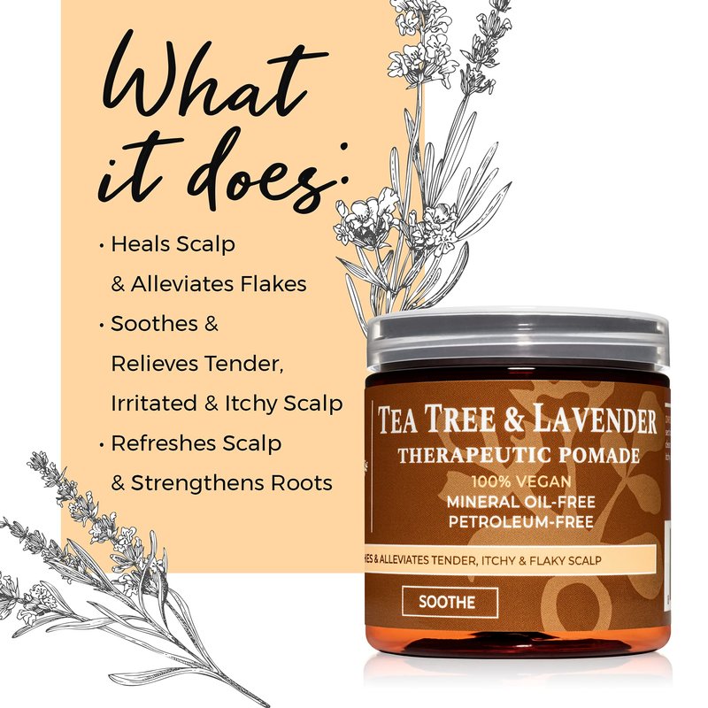Keep your scalp happy and healthy under protective styles. Our 100% vegan, mineral oil-free and petroleum oil-free pomade combines the soothing power of tea tree and lavender essential oils with the moisturizing power of coconut oil to help relieve tender and itchy scalp, combat dandruff and help strengthen roots.