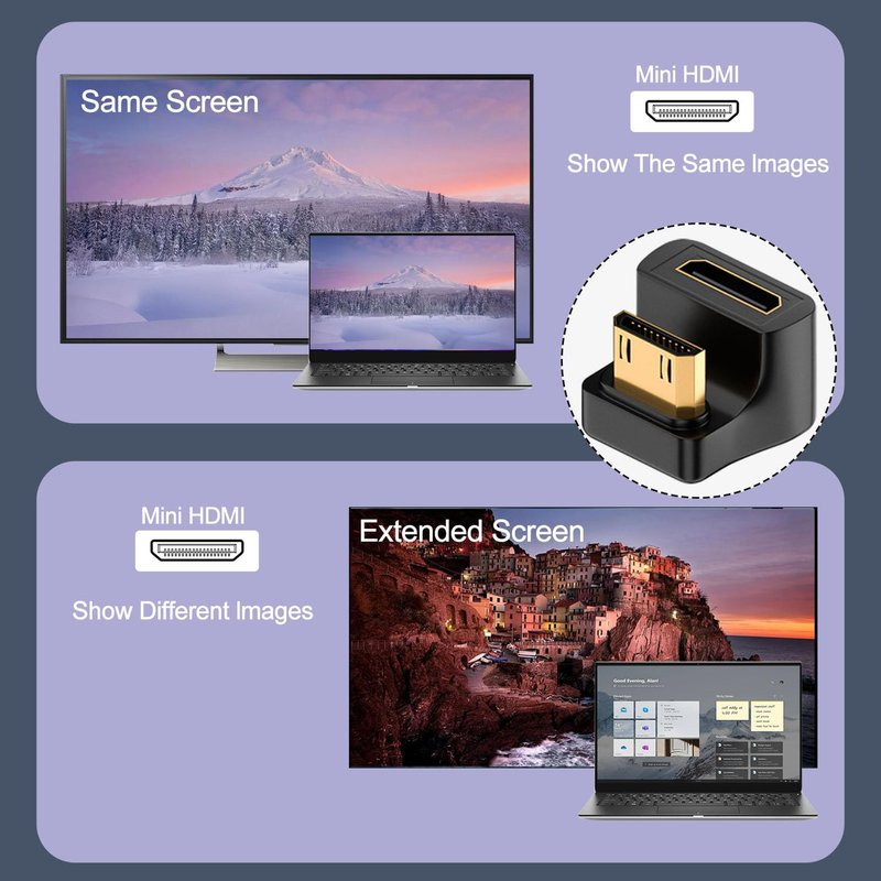 - 【8K HD】Mini HDMI Male to Mini HDMI Female 180° angle adapter, supports up to 8K@60HZ resolution, UHD 2.1 picture quality, 3D and multi-channel digital audio. It is fully compliant with HDMI 2.1 standard. (Note: In order to get 8K performance, cables, devices must support HDMI 2.1, and the length of the connected cable ≤ 3m)