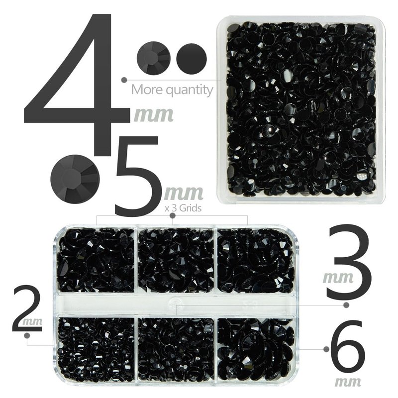 - ❤【2 Boxes Pure Black Resin Rhinestones + Stainless Steel Tweezer + Pickup Pen】3060PCS Pure Black flatback jelly rhinestones are assorted in 5 sizes: 2mm 1300PCS / 3mm 450PCS / 4mm 920PCS / 5mm 350PCS / 6mm 40PCS. Pure Black flatback Jelly rhinestones are very light and easy to carry, all gems are packed in each grid boxes according to different sizes, convenient to oragnize, no worry about rhinestones mixed together. Comes with 1 Tweezer and Pickup Pen for DIY Crafts.
