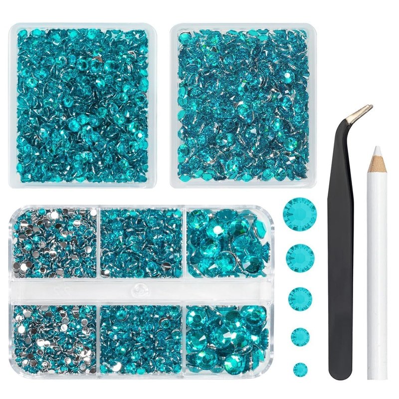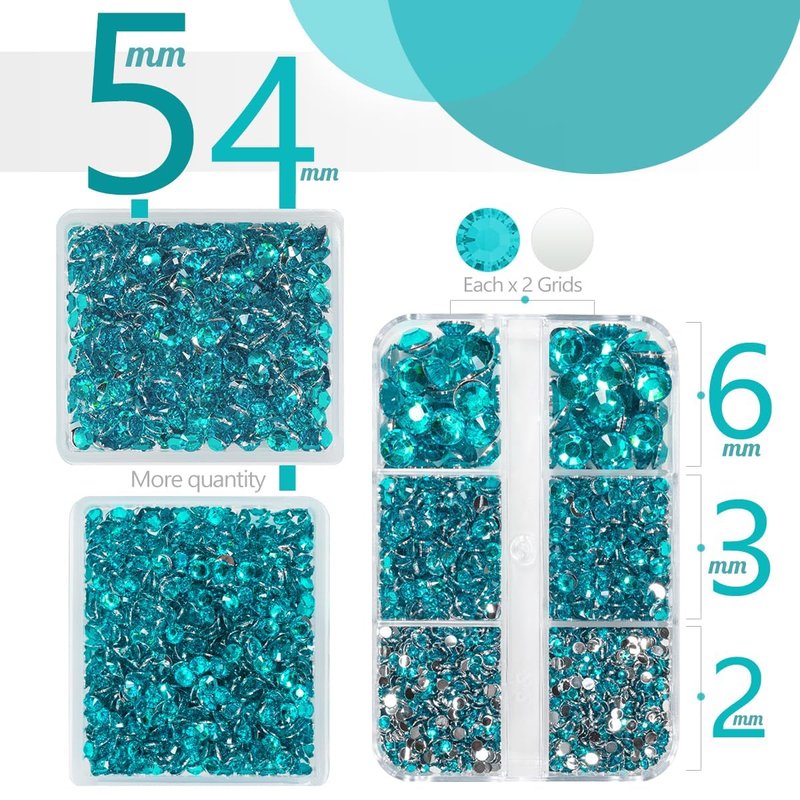 - ❤【3 Boxes Blue Zircon Resin Rhinestones + Stainless Steel Tweezer + Pickup Pen】5070PCS blue zircon flatback resin rhinestones are assorted in 5 sizes: 2mm 2700PCS / 3mm 820PCS / 4mm 920PCS / 5mm 550PCS / 6mm 80PCS. Turquoise Blue flatback resin rhinestones are very light and easy to carry, all gems are packed in each grid boxes according to different sizes, convenient to oragnize, no worry about rhinestones mixed together. Comes with 1 Tweezer and Pickup Pen for DIY Crafts.
