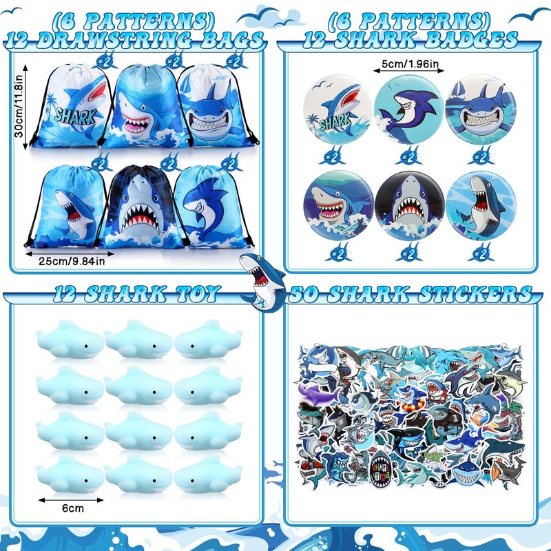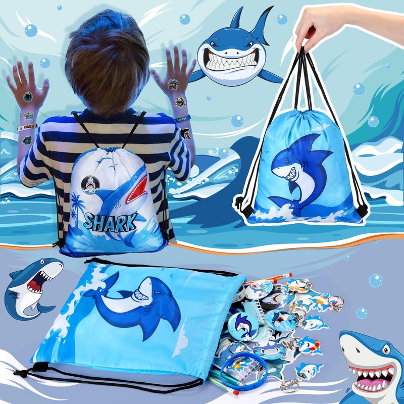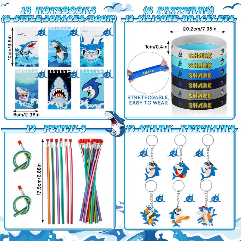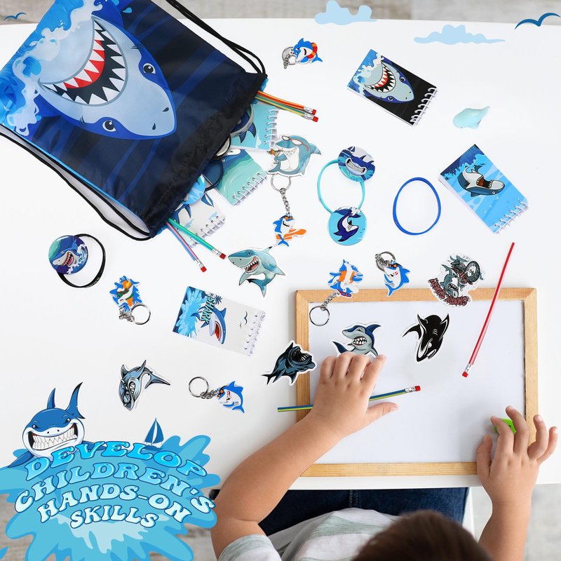 - Shark Party Favors: you will receive 140 pieces of shark birthday party supplies, including 12 shark themed drawstring bags, 18 notebooks, 12 badges, 12 silicone bracelets, 50 shark stickers, 12 bendable pencils, 12 shark stress relief toys and 12 shark keychains; Ample quantity and ideal combination to meet your decoration and party favors needs