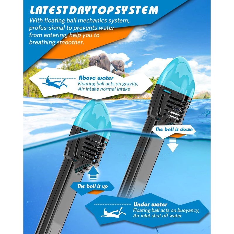 - 【Anti-Fog and Anti-Leak】Separate inhaling and exhaling channels stop the top snorkel mask from fogging up, and anti-fog coating on the lens and anti-fog inserts guarantees anti-fog effect; advanced leak-proof silicone sealing mask with floating ball prevents salty water from entering in mask.