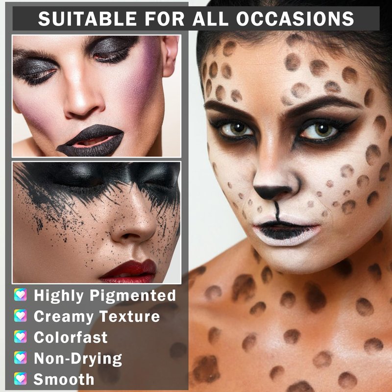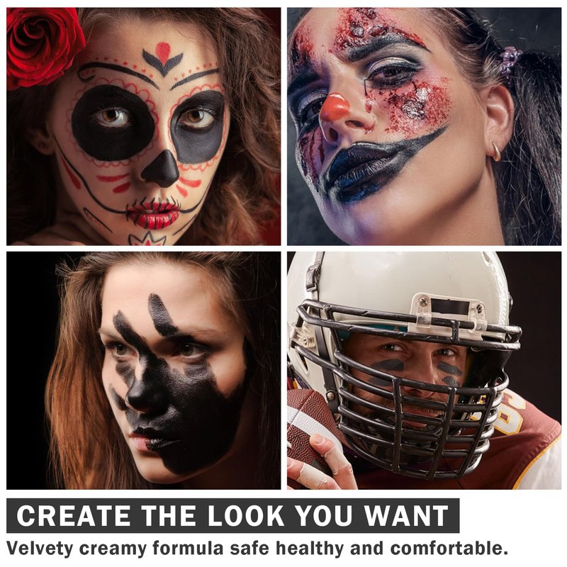 - 【Black Face Paint Stick】Face paint stick can be used for body and face painting to create Halloween,zombie vampire,clown,skeleton,cosplay,SFX makeup and other painted makeup looks;It can also be used to create football,baseball,softball and other sports makeup,reduce stadium light glare and sun glare,allowing athletes to focus more on their games.