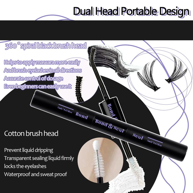 - 2 in 1 waterproof lash bond and seal:Glue and sealed double tube design, the brush head uses 360 ° spiral mini eye black brush head to help more easily apply glue. The glue is black, the sealing liquid is transparent, and when paired with fake eyelashes, it looks more natural.
