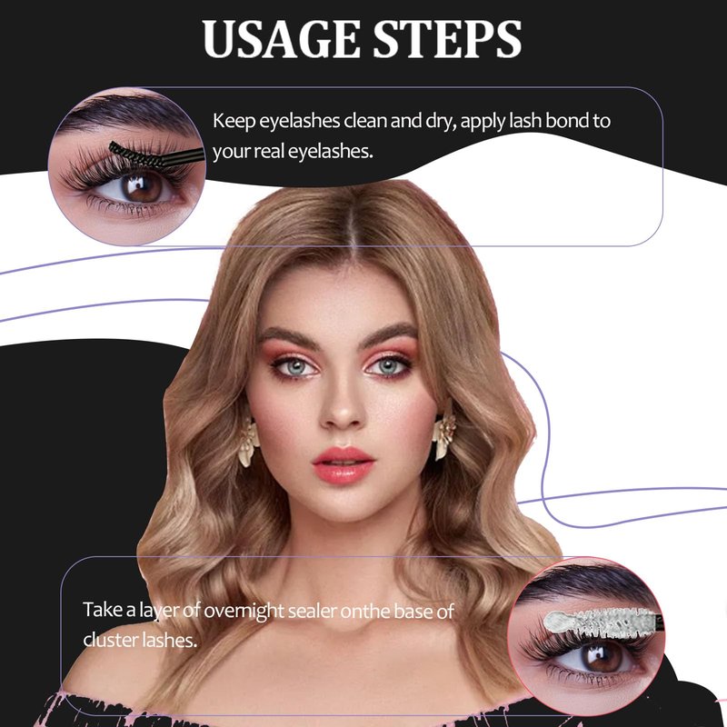 - Easy to use:1:Clean the eyes and eyelashes before use. 2:Apply glue to the base of your own eyelashes using the bond end. 3:Take a single eyelash from the base of the eyelashes and apply it below them. Use tweezers or eyelash curlers to tighten the eyelashes. 4:Apply the seal end evenly.