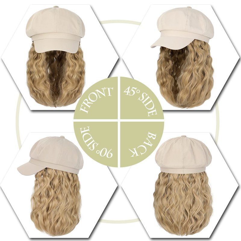 Qlenkay Newsboy Cap with Bob Hair Extensions Khaki Hat Wig 8 Panel Visor Beret Attached Synthetic 14'' Short Curly Wavy Hairpiece for Woman Ash Blonde