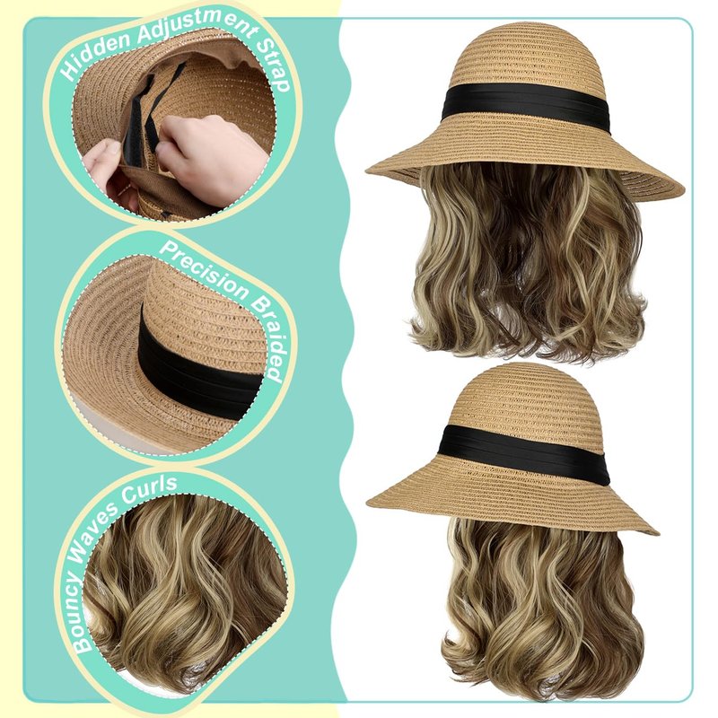 Qlenkay Straw Sun Hat with 10in Synthetic Hair Extension Short Wavy Curly Wig Wide Brim Women Adjustable Cap Detachable Hairpiece for Summer Travel Light Brown Mix Ash Blonde
