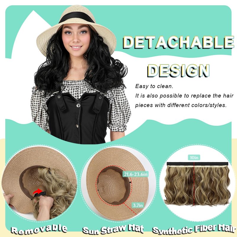 - Cute style and quality material. Sun hat attached hair extensions are made of high-quality synthetic fiber, which feels as smooth and soft as real hair. The hairpieces are 10 inches long. The summer straw hat is made of paper straw and polyester. It's soft to the touch yet sturdy.