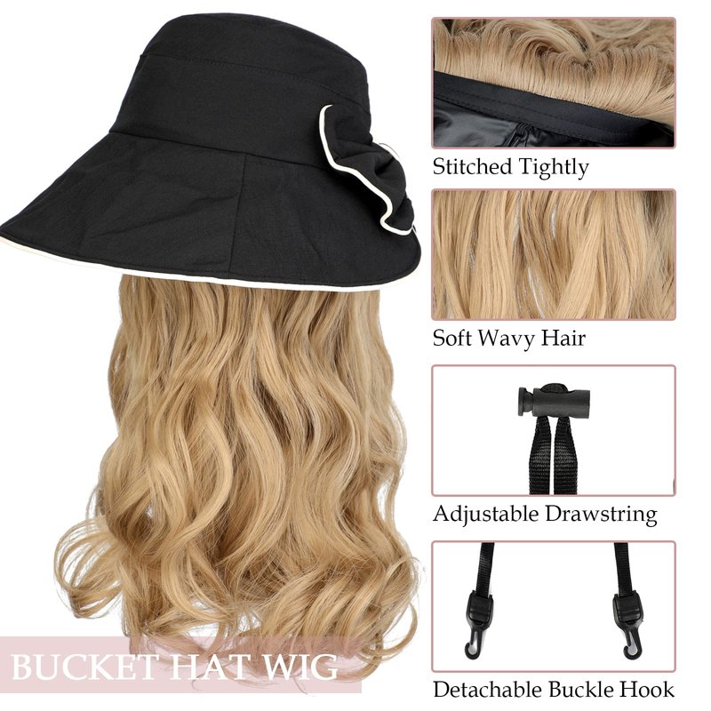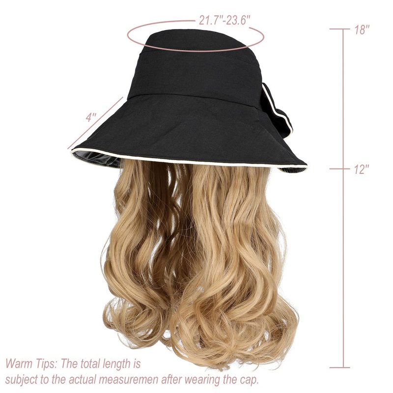 - Specification and Material: Sun hat attached with gorgeous long curls hair. The hair pieces are made of high-quality synthetic fibers. Felt soft and still stays wavy! The bucket hat is made of polyester, lighweight, breathable and comfortable. Total length: 18in(actual measurement shall prevail after wearing the hat); Hair length: 12in.
